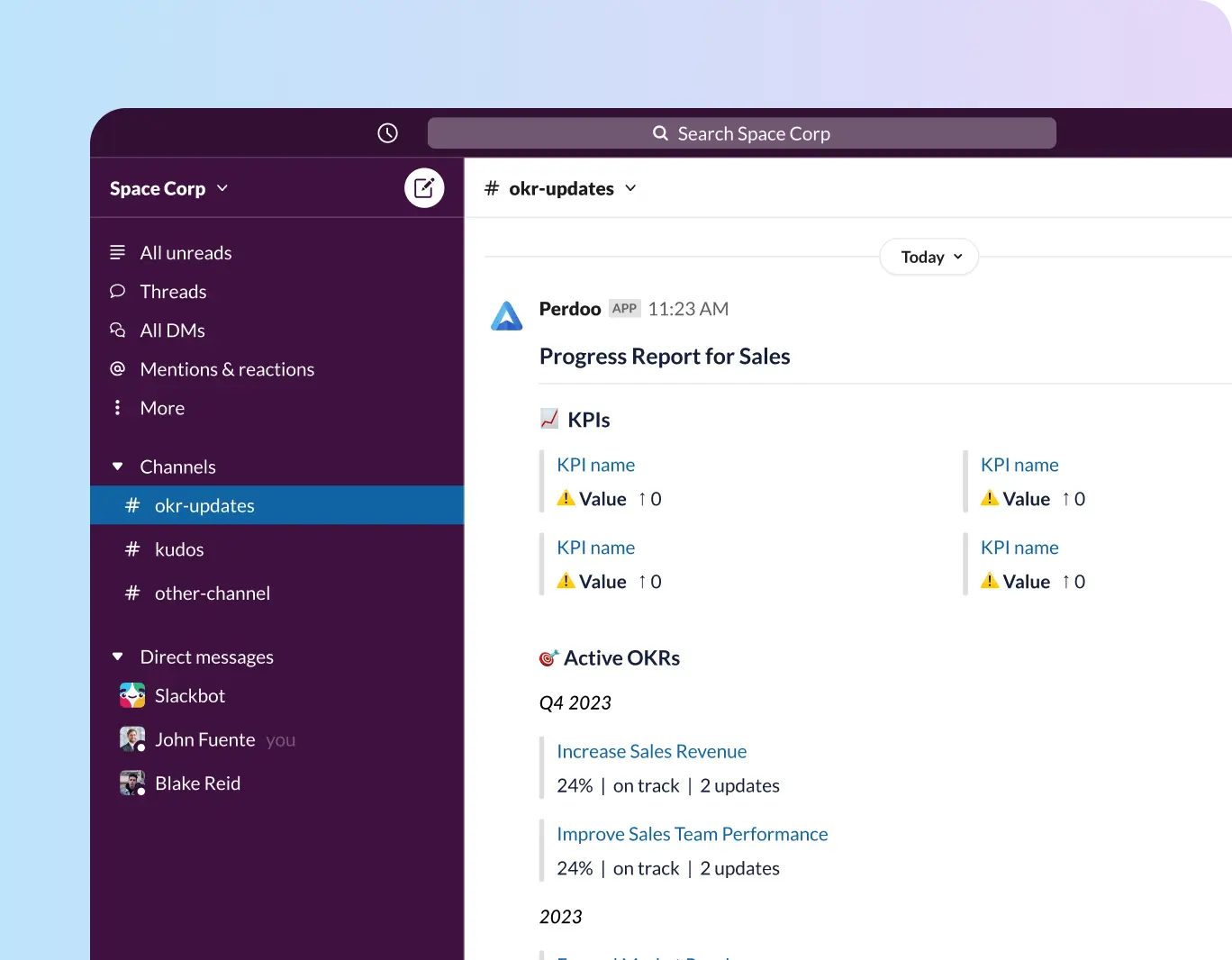 Integrate Perdoo with your favorite communication tool. Share goals, check in, and stay up-to-date on progress — all without having to leave your Slack or Teams environment.