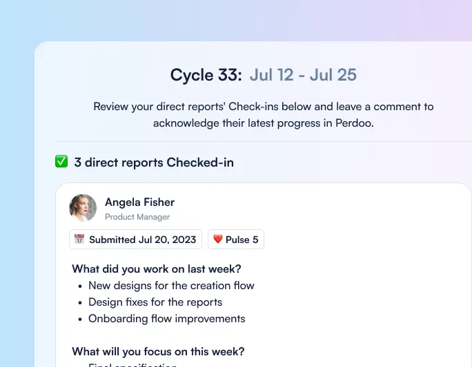 Regularly share wins, challenges, and progress with managers and co-workers. Achieve more goals, improve 1:1s with managers, and remove recency bias from Performance Reviews. All it takes is 5 minutes per week.