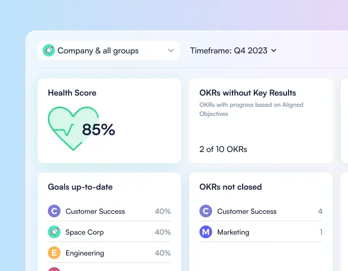Get a holistic overview of how your entire organization is performing across teams & timeframes. Stay on top of everyone's progress and instantly see what's at risk. Help remove roadblocks where needed.